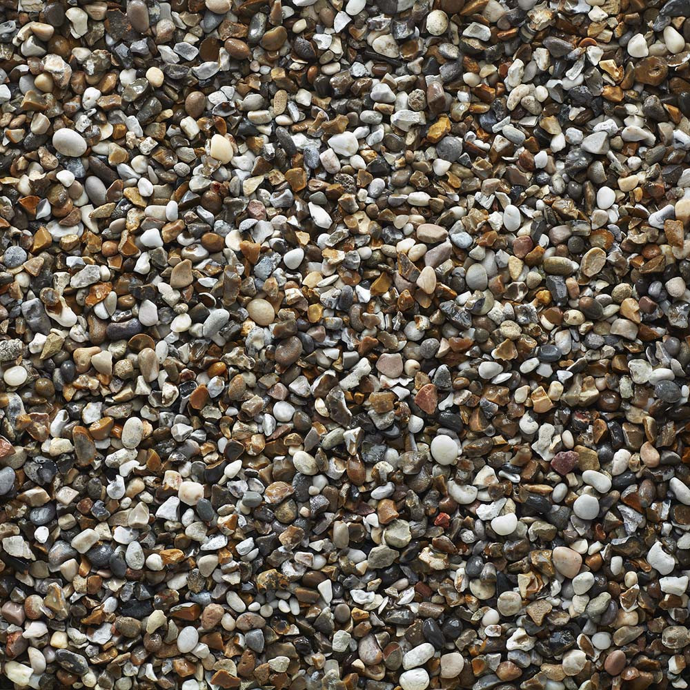 • Angular flint-based gravel that features a wide array of colours, including gold, white, grey, cream, brown and black