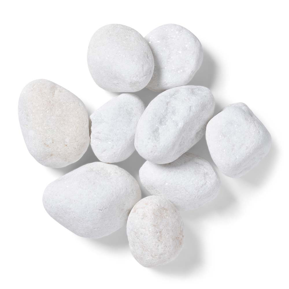 • Premium quality naturally veined, river-worn cobbles with a strikingly white finish