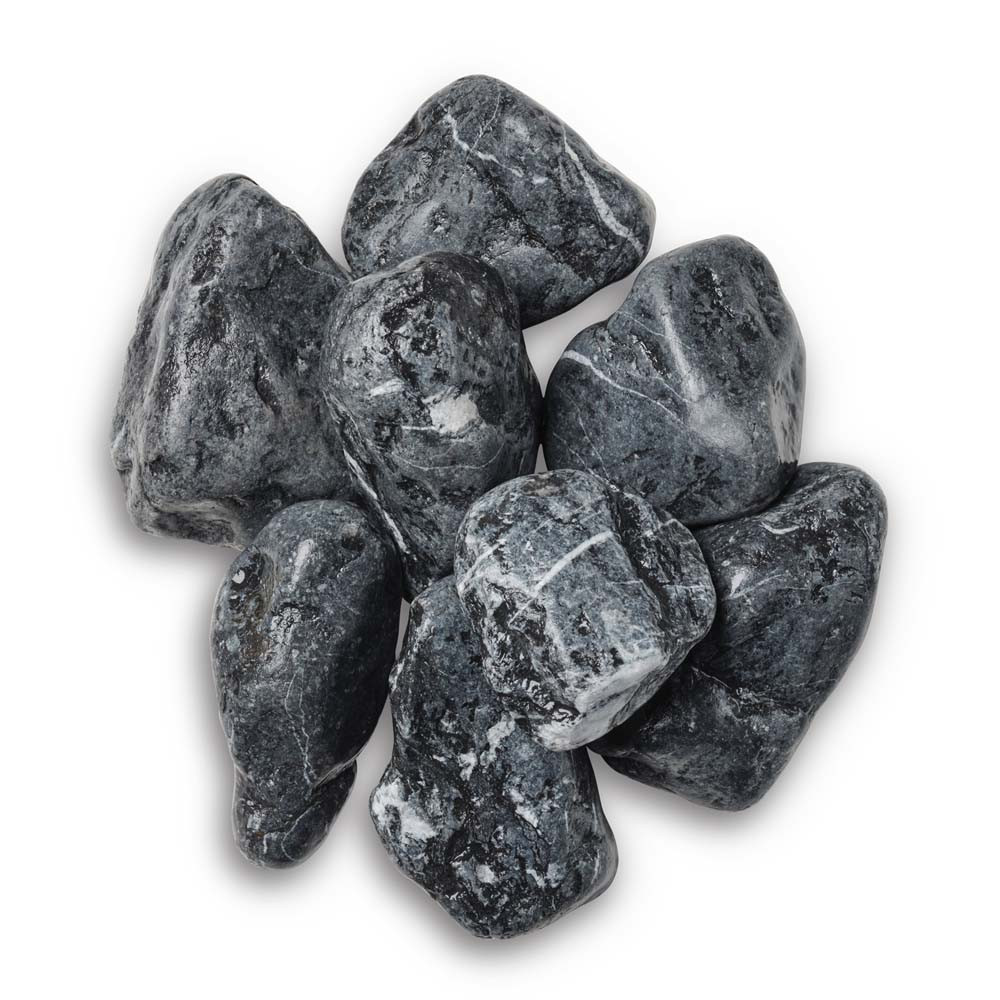 • Premium quality naturally veined, river-worn cobbles with a bold dark finish featuring shades of silver, grey, black and white