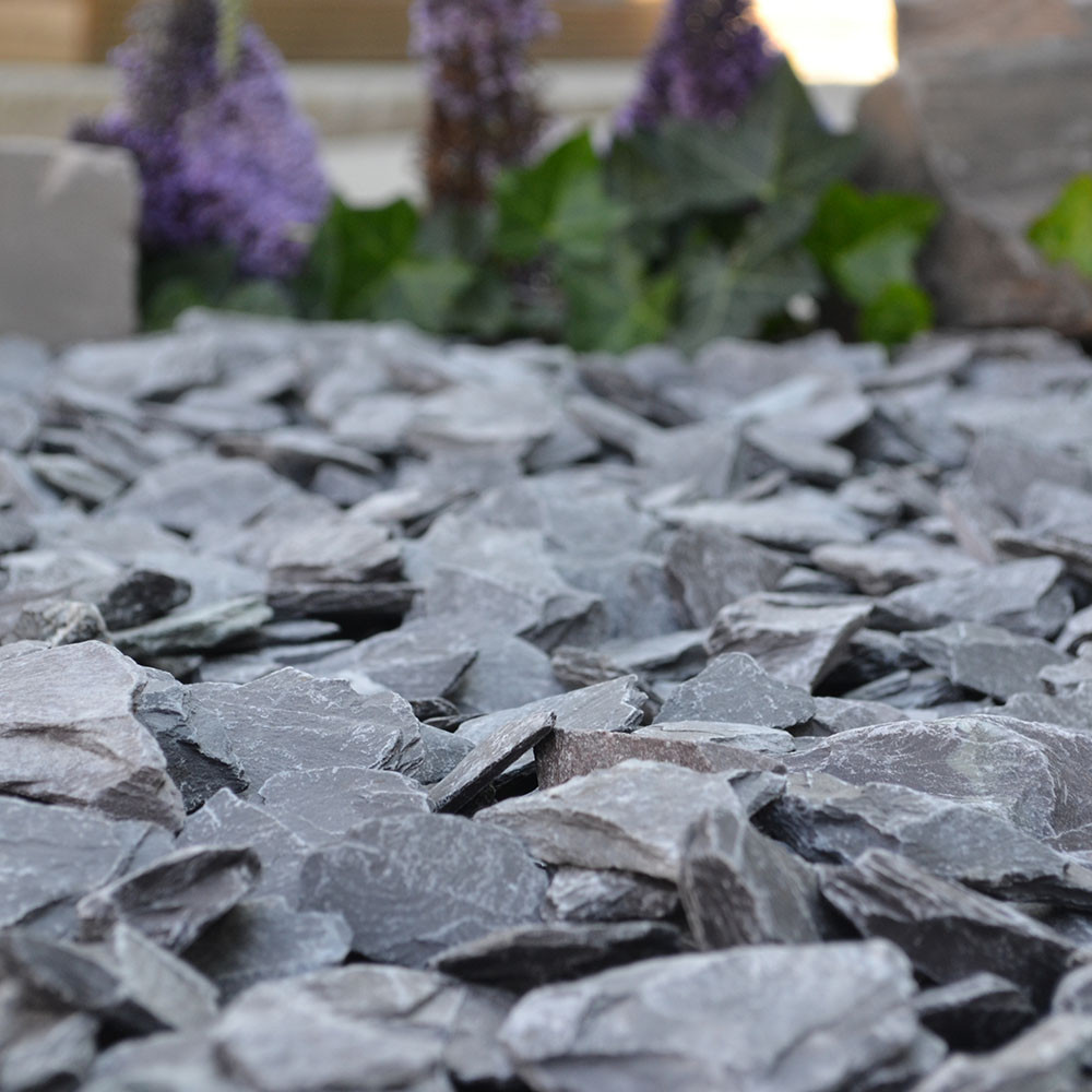 • 20mm to 40mm rough, angular-shaped slate aggregate featuring a beautiful blend dark grey and deep purple tones