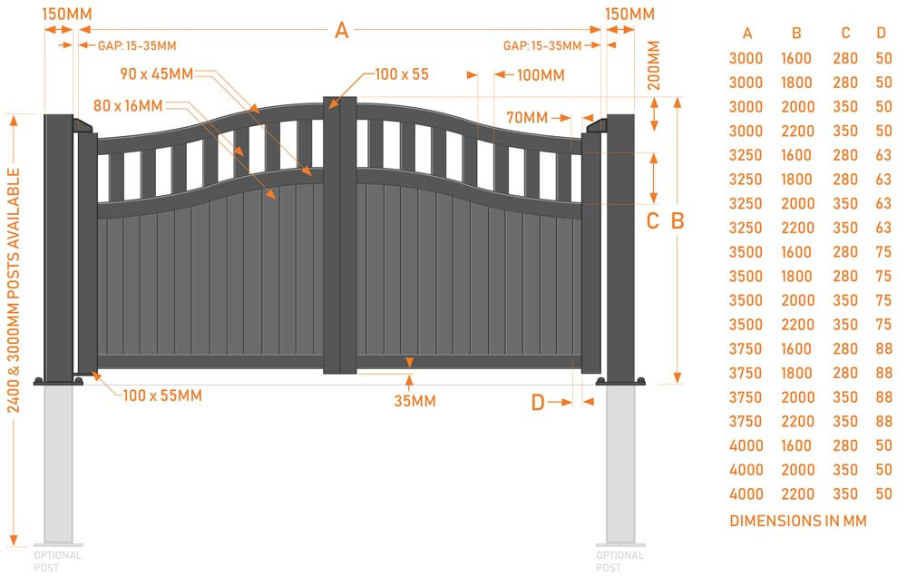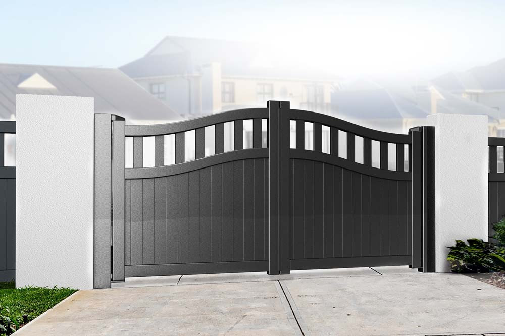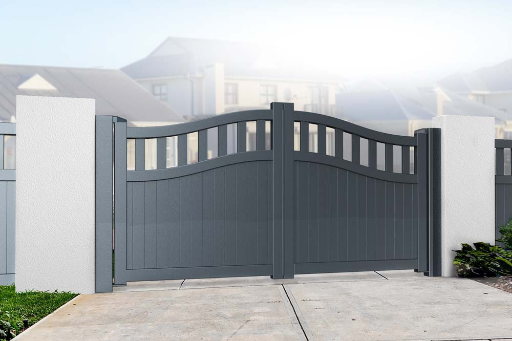 This partial privacy driveway gate features a vertical solid infill and bell-curved top, making it perfect for traditional and more contemporary properties. The top section of the gate features vertical slats, which allow you to see to the other side of the gate when closed. This means you can identify visitors to your property without opening the gate first.