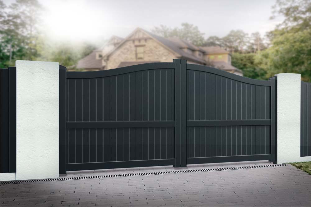 Featuring a charming bell-curved profile that brings a traditional style to this contemporary design, the Beaumont Fully Finished Aluminium Double Swing Driveway Gate by Door Superstore is perfectly suited to homes with long driveways that lead onto busy roads and other public spaces.