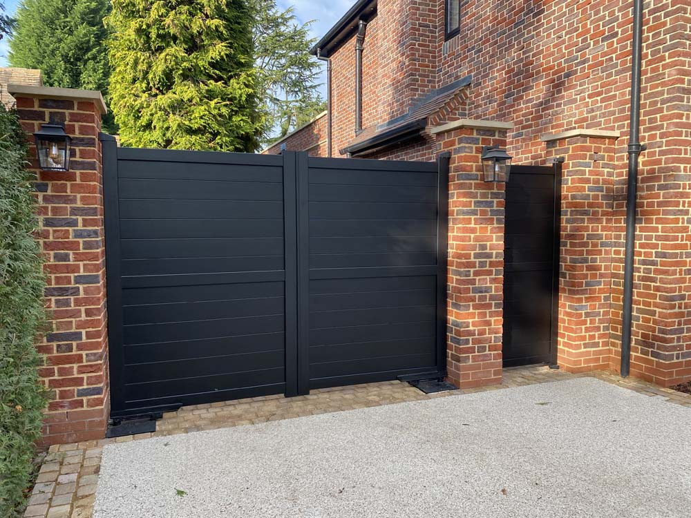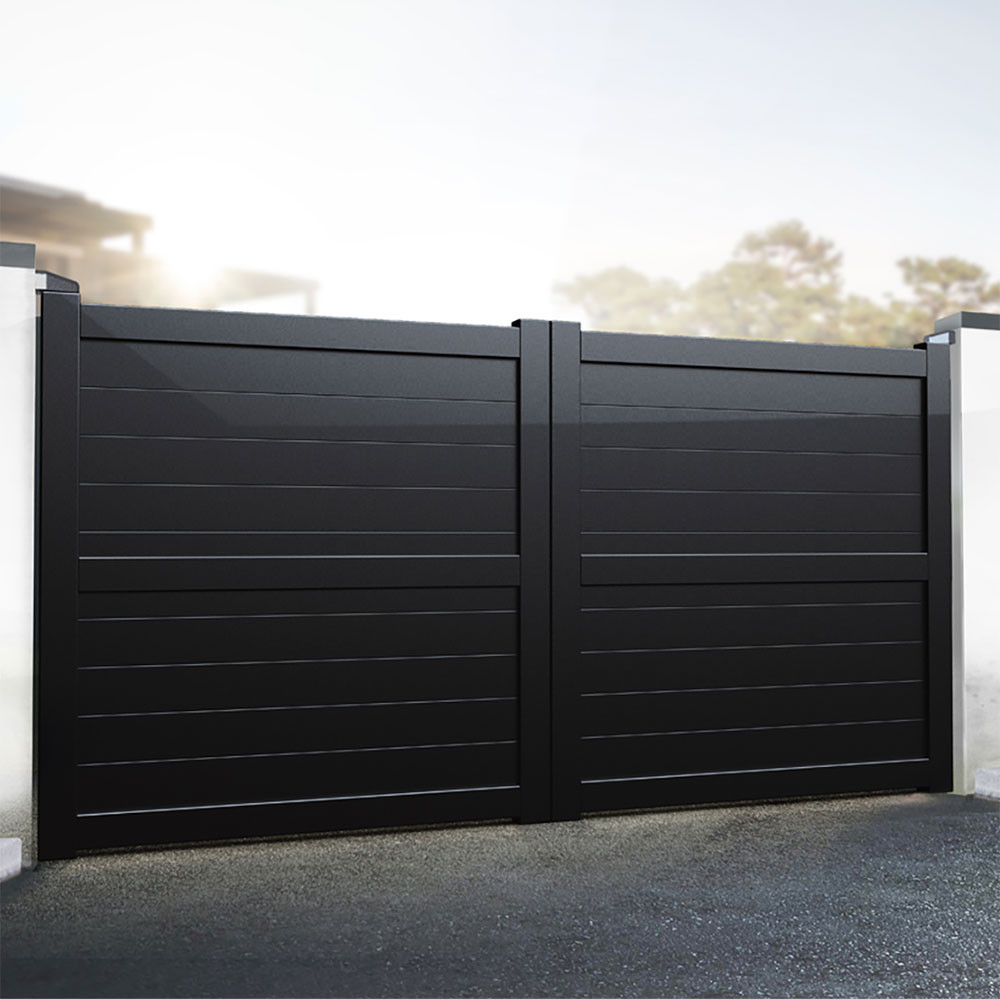A perfect solution for properties with driveways that lead straight onto busy roads, the contemporary Door Superstore Sterling Fully Finished Aluminium Double Swing Driveway Gate ensures excellent privacy and security. The gate's design features a horizontal solid infill and a flat top, complementing horizontal panelled fencing.