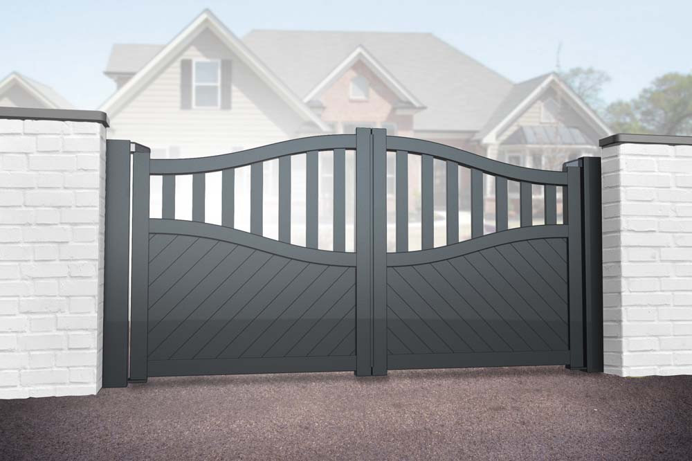 This partial privacy Door Superstore Winchester Fully Finished Aluminium Double Swing Driveway Gate features a sleek solid infill with diagonal grooves and a bell-curved top. This classic profile brings a decorative element to the gate, making it an ideal option for both traditional and modern homes.