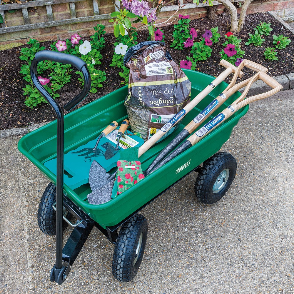 The Draper Mobile Tipper Cart - 75L has a maximum load of 200kg with a 75l tipping tub. The foam comfort grip handle and pneumatic wheels make it easy for the user to move heavy materials. This cart is particularly useful for garden-related projects.