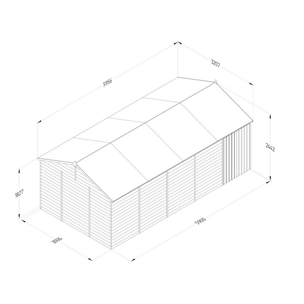 The 20ft x 10ft Forest Garden 4LIFE Reverse Apex Shed with No Windows and Double Doors is a spacious and stylish addition to any outdoor space. Designed with a reverse apex roof, smooth-planed barge boards, and a decorative diamond-shaped finial, it brings both function and charm to your garden. Whether used for storage or as a large workshop, this shed offers exceptional versatility.