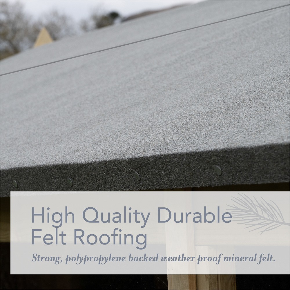 Built in the UK from FSC-certified timber, the shed features robust interlocking shiplap cladding for a durable, watertight construction. A double Z-framed door adds strength and prevents movement over time, while the 8mm solid roof sheet, finished with a green weatherproof felt cover, ensures protection in all seasons.