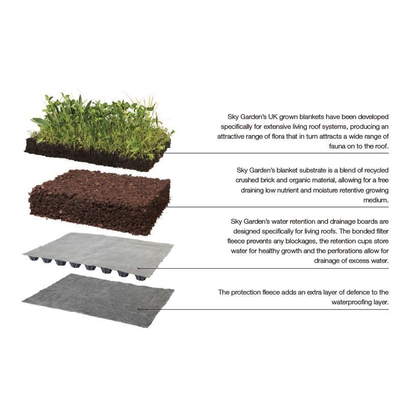 • Sedum blanket (30mm) with 8-12 species specifically chosen for green roof application.