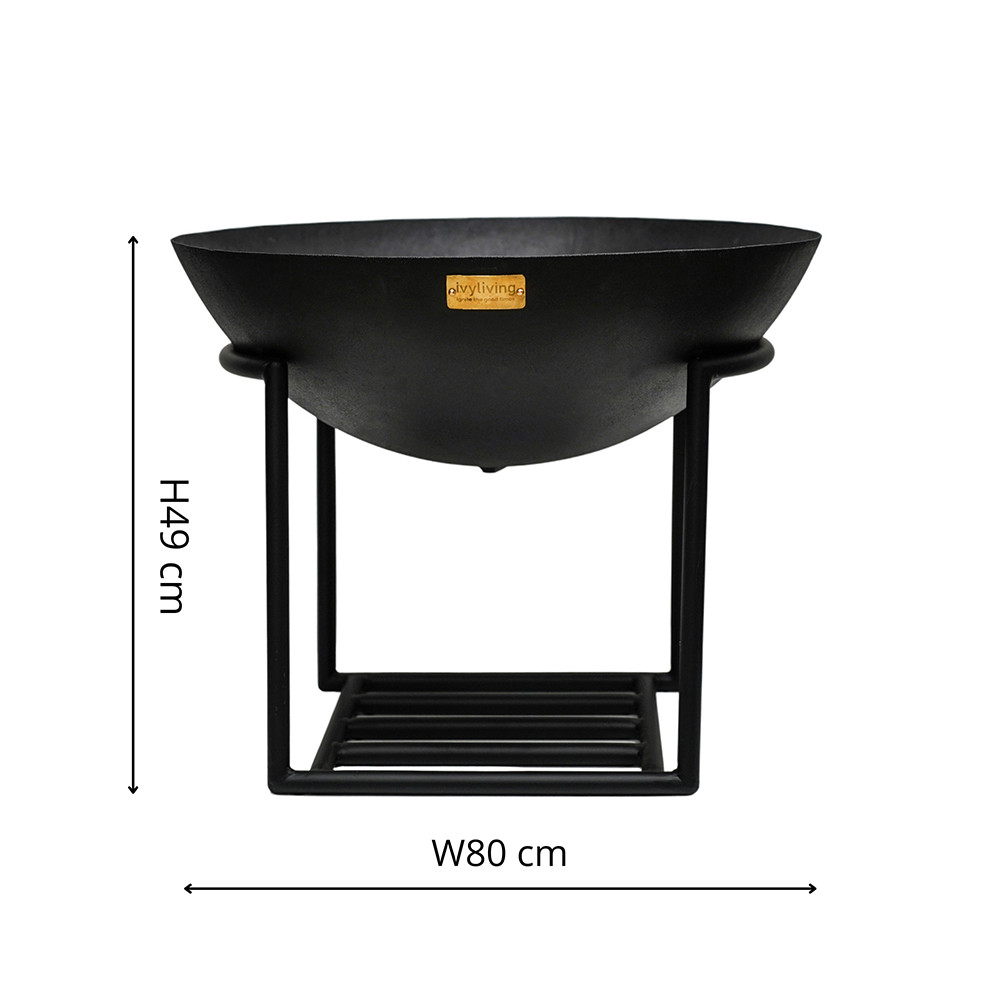 Constructed from robust cast iron, this fire pit sits on top of a sturdy. geometric stand, ensuring a stable foundation. There's ample space below to store logs, guaranteeing you can enjoy vibrant, long-lasting fires well into the night.