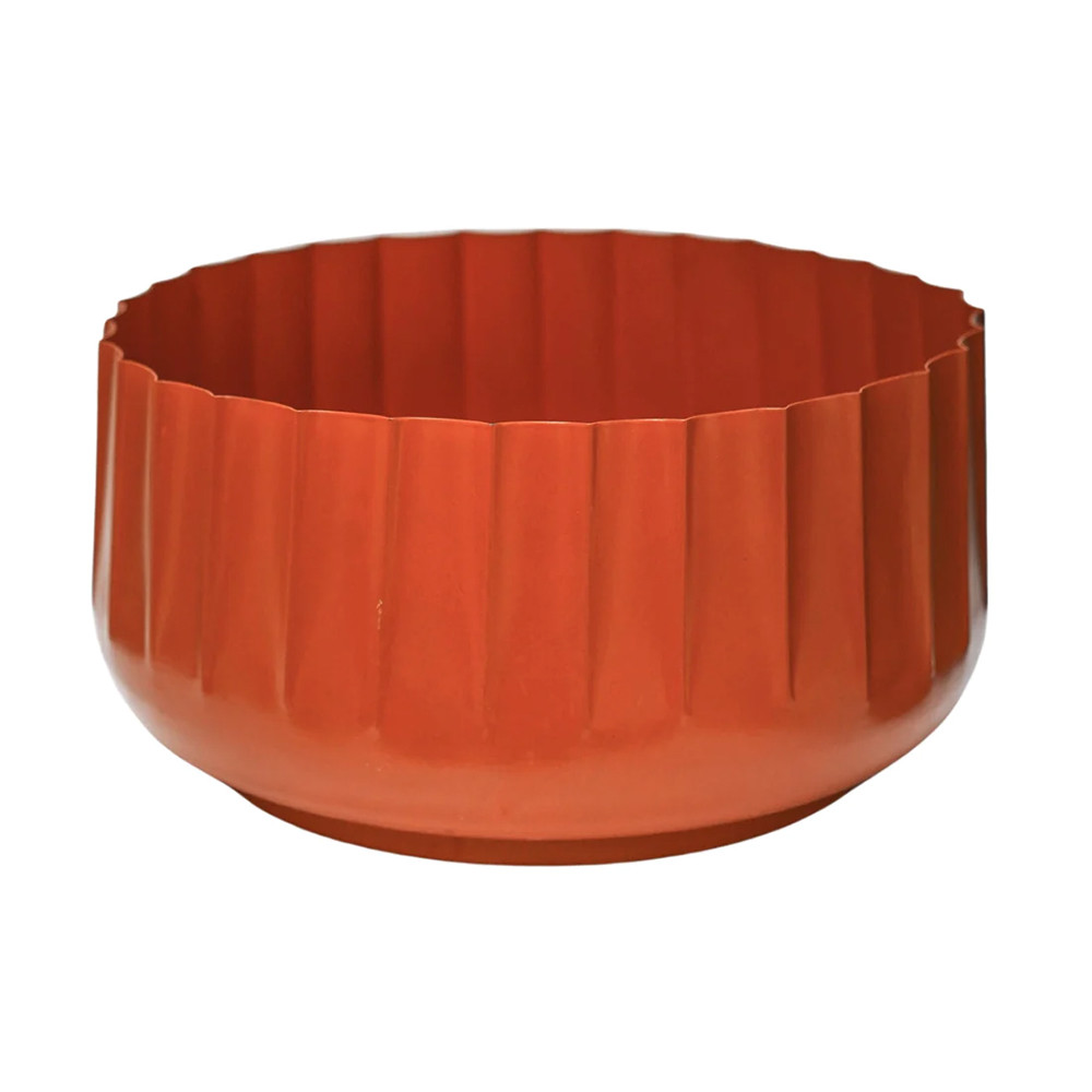 • A stylish planter design with a vibrant orange finish and corrugated edge