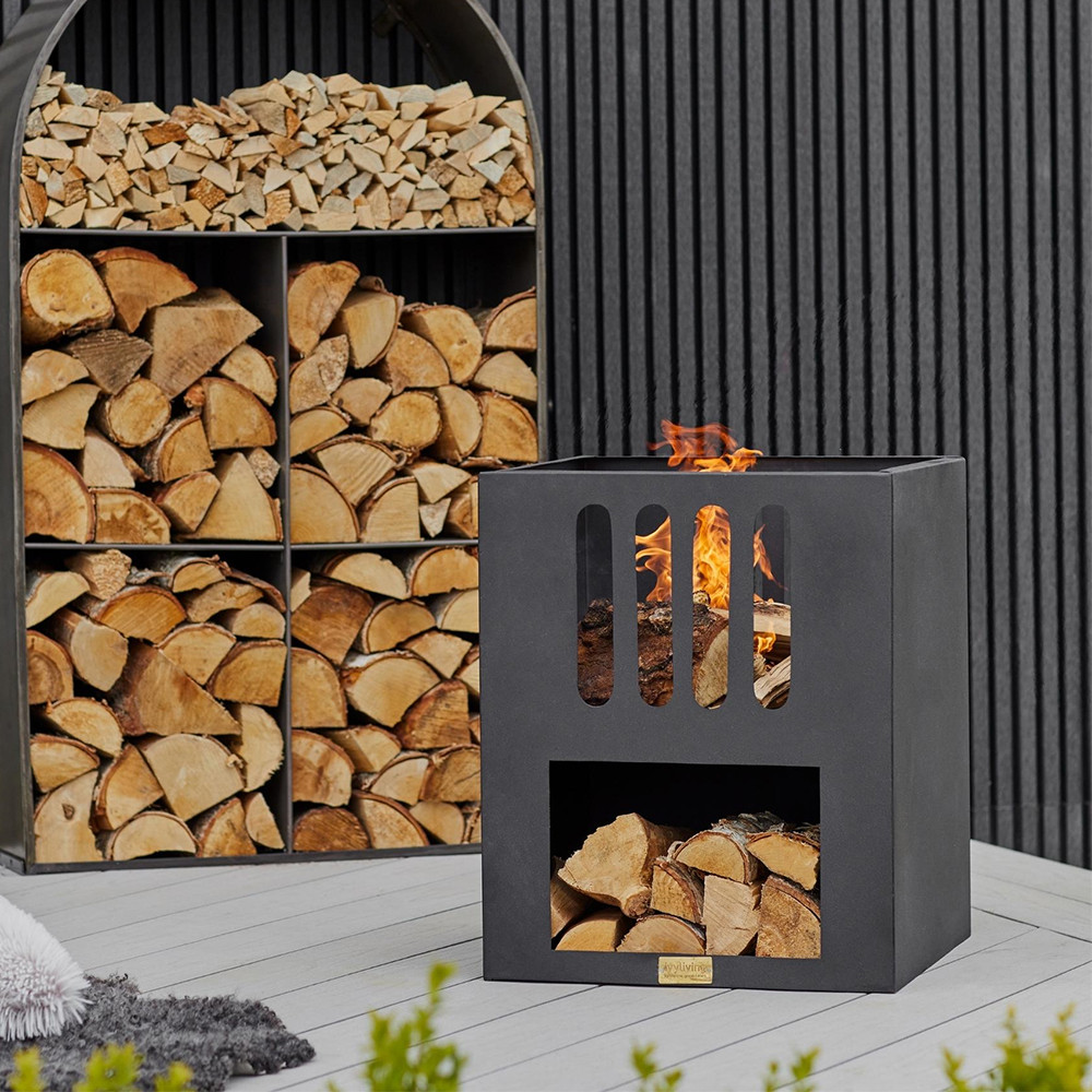 This fire pit's frost-resistant exterior ensures it retains its appeal throughout the year, even during winter. Notably, it features a generous storage space, ideal for neatly storing your firewood.
