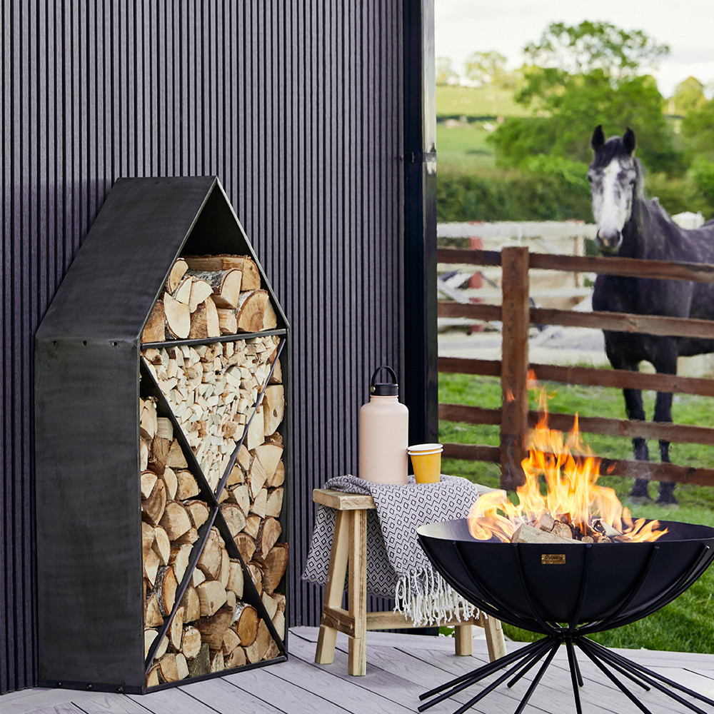Featuring six distinct storage compartments, this house-shaped design has a black finish that seamlessly harmonises with a diverse range of contemporary garden styles. When affixed to a wall, the log storage unit's angular lines introduce an element of modern style to your outdoor area.