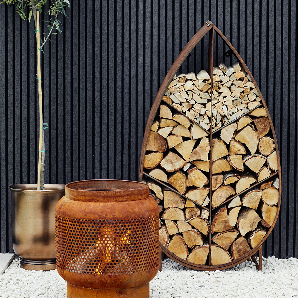 Features & Benefits: Natural Rust Leaf on Stand Sculptural Log Storage - 1240mm x 700mm