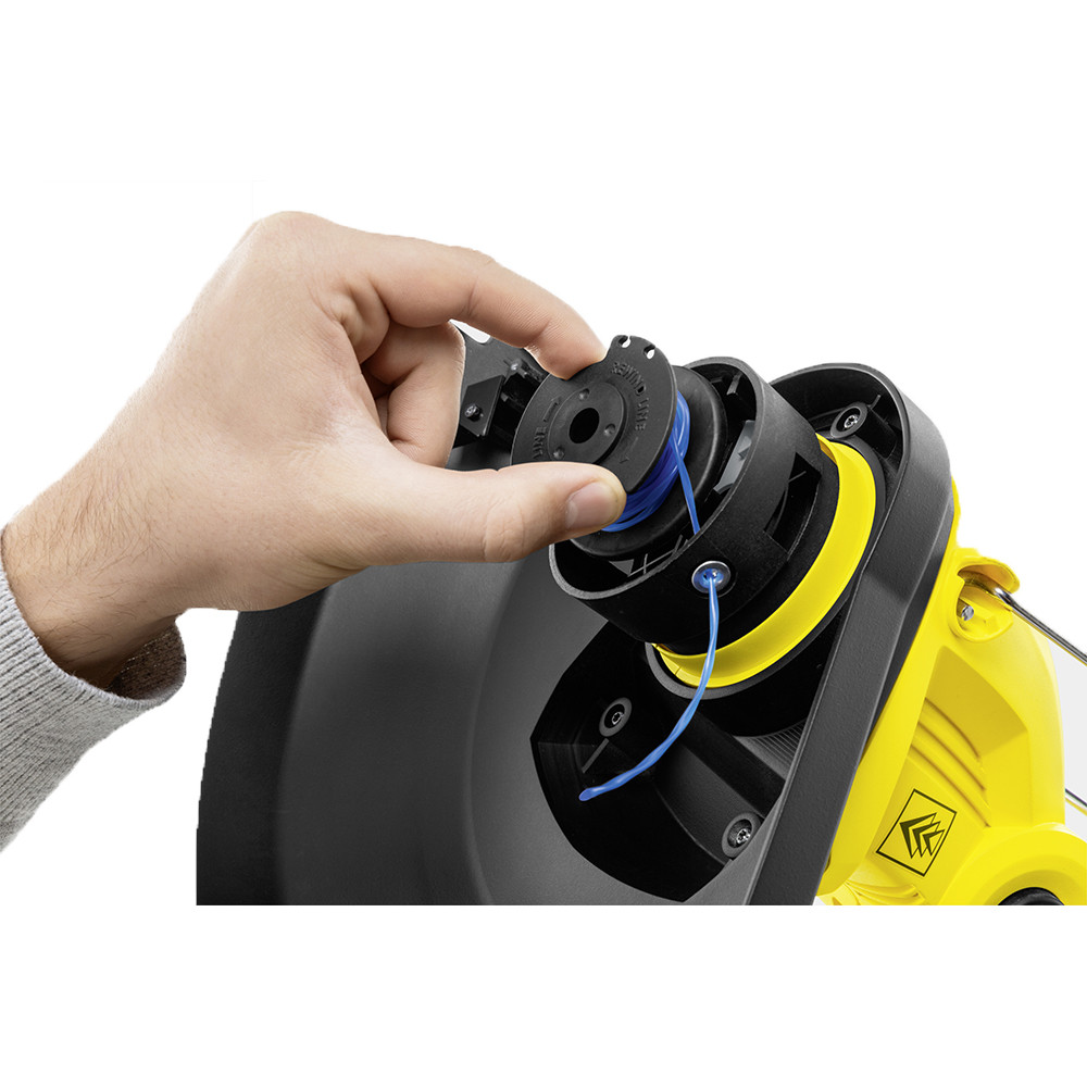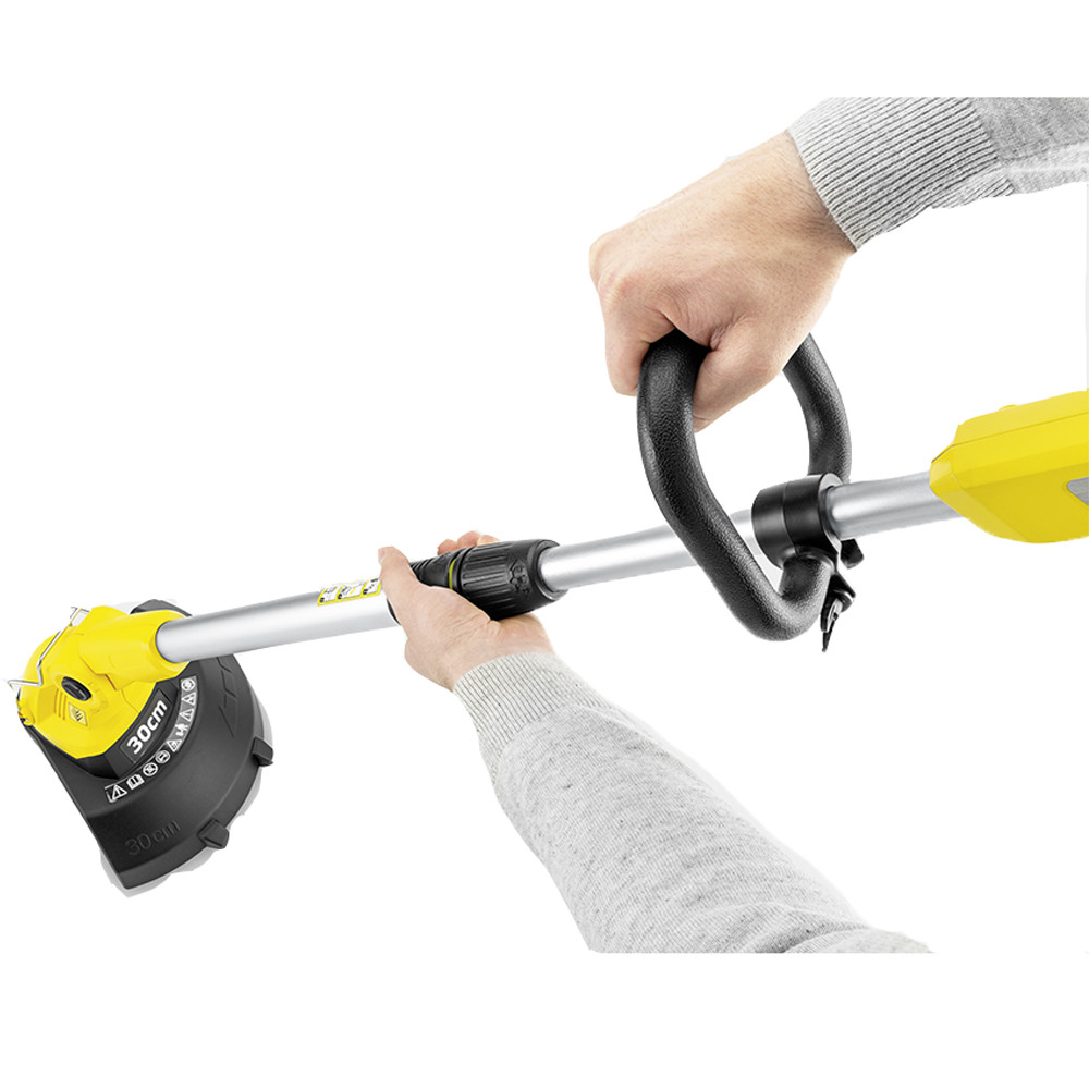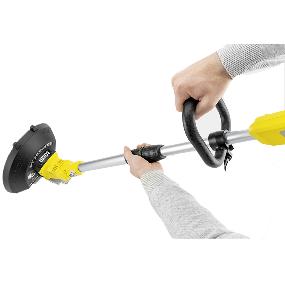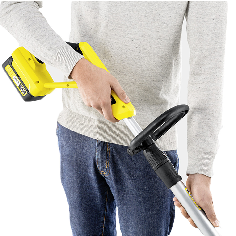 This lawn trimmer is compatible with the Karcher 18V 2.5Ah or 5.0Ah batteries.