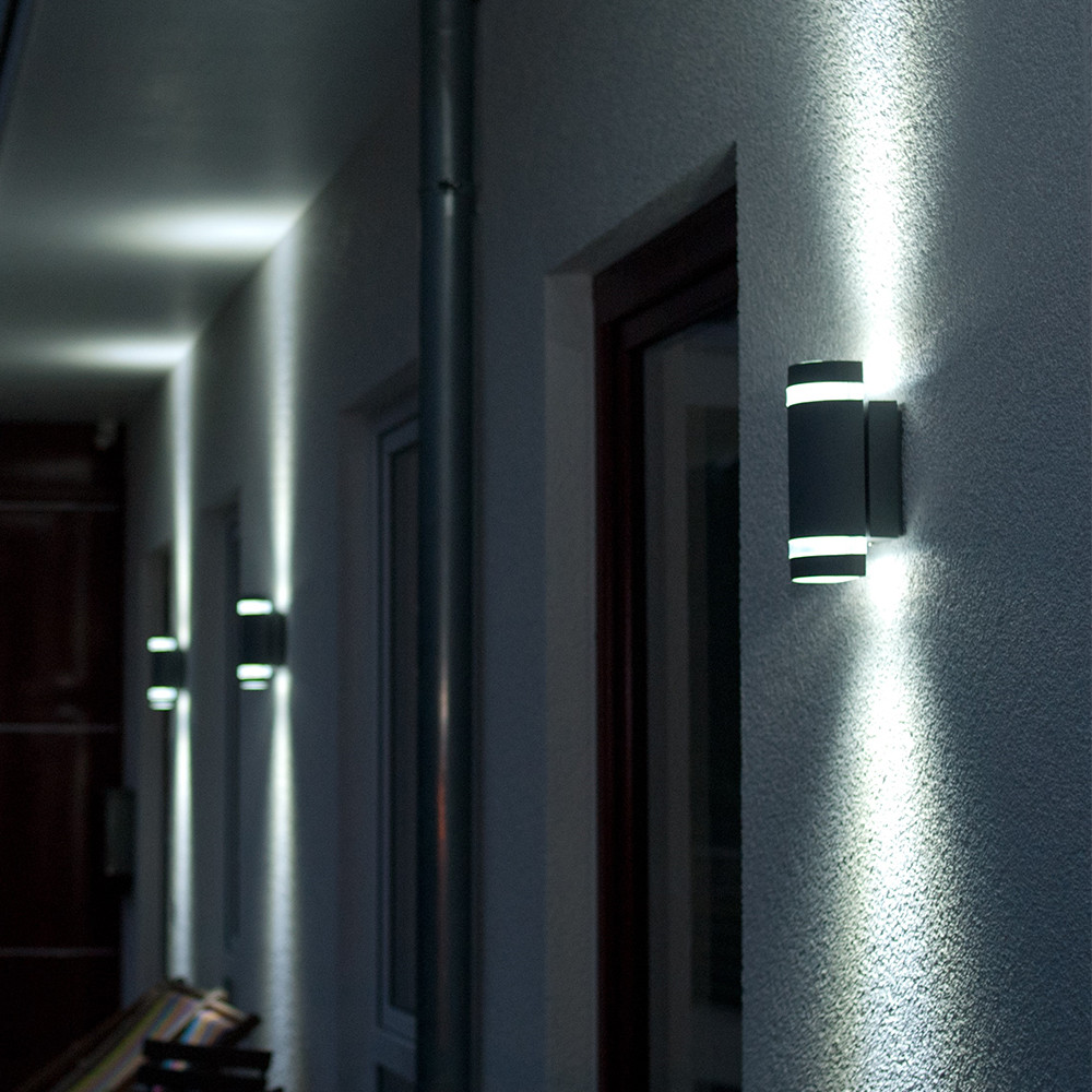 With a weatherproof anthracite grey finish, heavy-duty aluminium construction and impact-resistant clear diffusers, each lamp has two GU10 lamp holders, accommodating two LED bulbs (bulbs are not sold with the lamp). The correct position of the LED engine will guarantee the perfect light pattern for this wall washer.