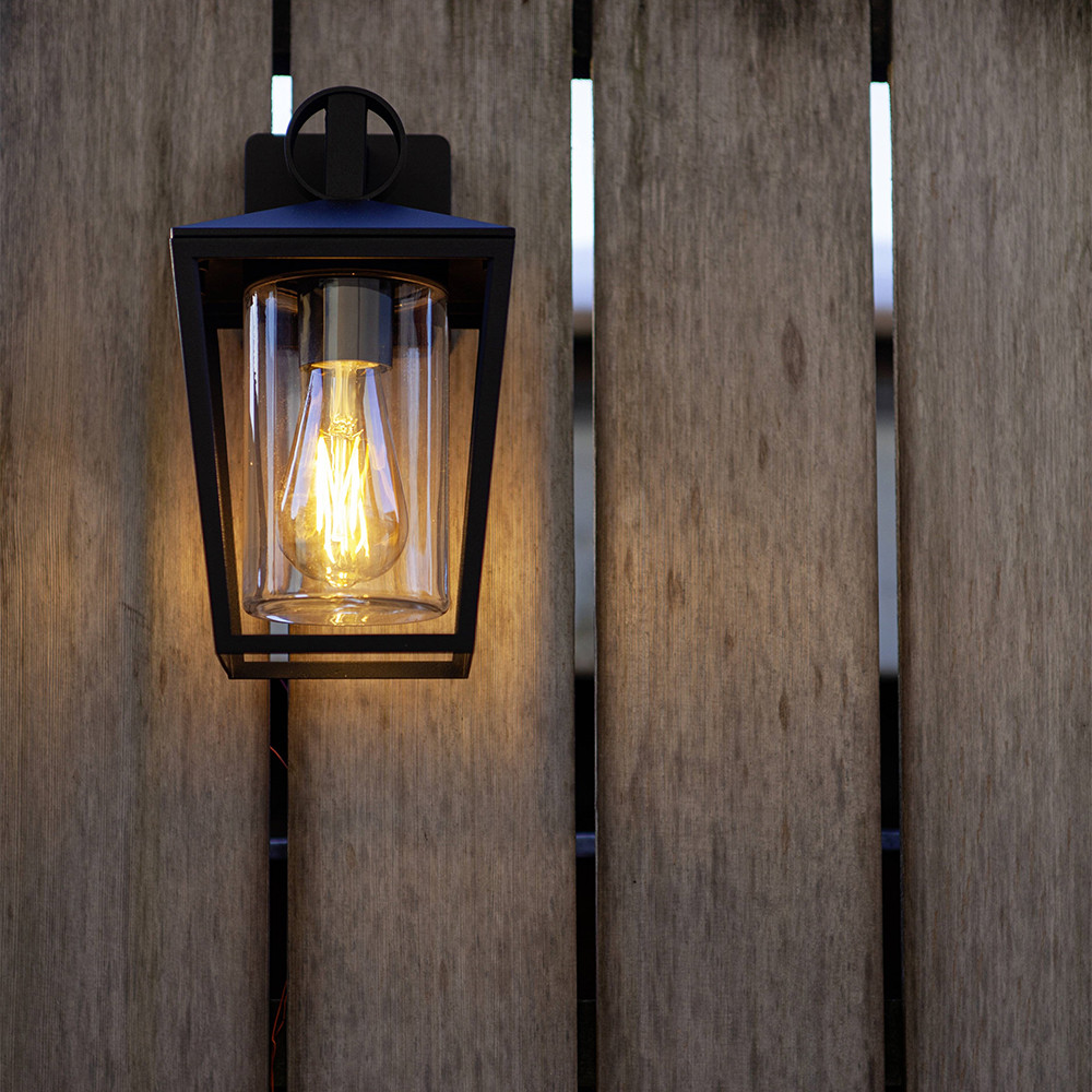This West IP44 Outdoor Wall Light by LUTEC is a soft wall light that is ideally suited for areas that require gentle illumination, such as a front door, a garden shed or a summerhouse. Featuring a heavy-duty aluminium open frame and finished in a bold matt black coat, its cylindrical clear glass diffuser creates a beautiful decorative, chic look.