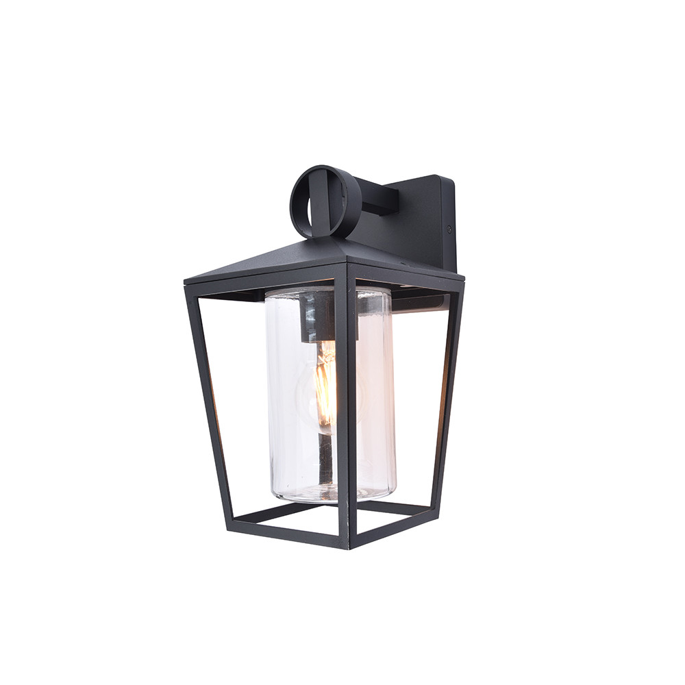 • An elegant outdoor light design with an open frame and cylindrical glass diffuser