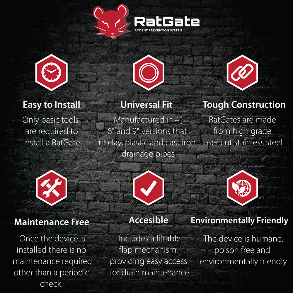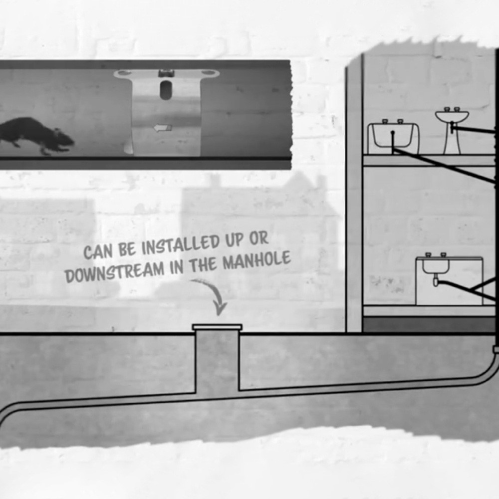 From RatGate, this 4-inch Stainless Steel Rodent Prevention System is designed to stop rats from migrating into your properties from the sewer system in a humane way. UK-manufactured and compatible with both the up and downstream direction of flow, it blocks the rat's path without restricting water and waste on its way to the drain.