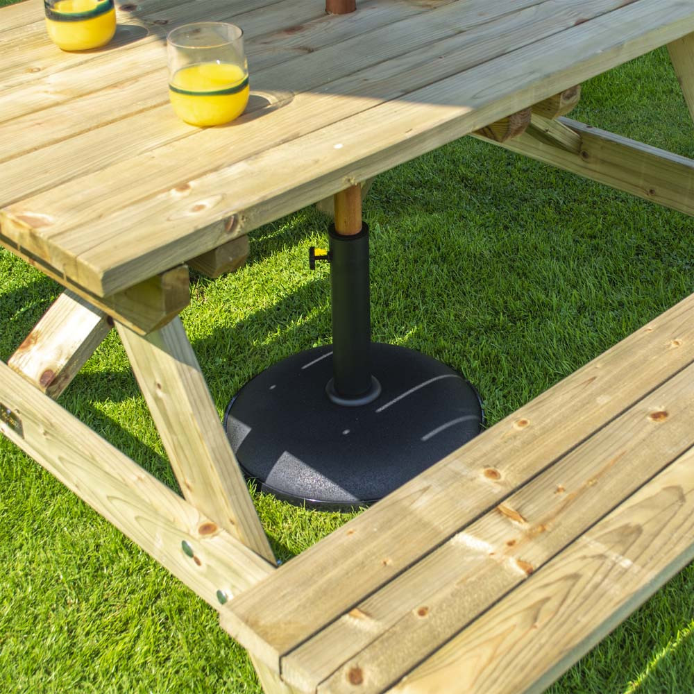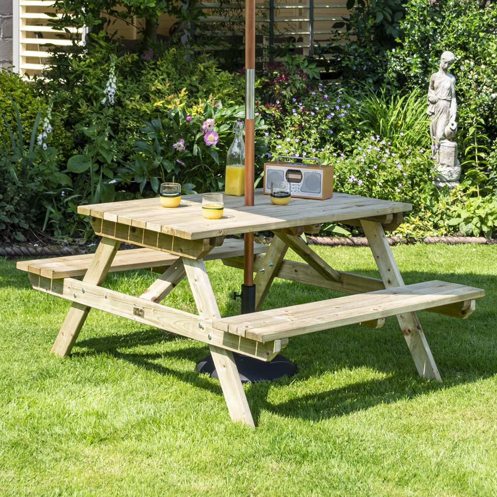 Features & Benefits: DISCON - Rowlinson 4 Seater Natural Timber 4ft Picnic Table 1200mm x 1500mm - Green Parasol & Base