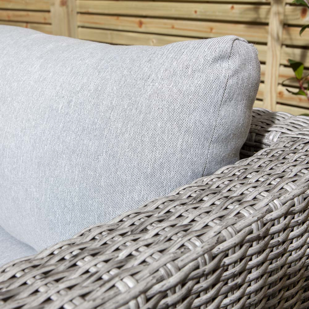 Suitable for indoor use as well as outdoors, the set is furnished with light-grey cushions and a contemporary rattan effect that will bring a stylish feature to your patio, veranda, summerhouse or conservatory. The set's powder-coated aluminium frame will ensure a lightweight structure, making manoeuvring each piece into position relatively easy. It also ensures the set possess excellent strength and sturdiness, able to provide you with years of enjoyment.