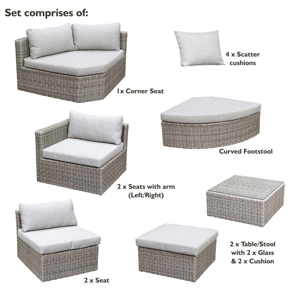 The set comprises a large corner seat, two seats with armrests (left/right), a large curved footstool, two seats without armrests, and four scatter cushions. The set also includes two square tables with toughened glass table tops to protect the rattan effect weave from staining. Should you require even more seating options, however, the tabletops can be replaced with two square cushions (included), which transform your tables into padded and comfortable stools.
