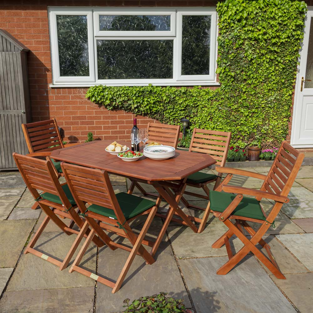 Features & Benefits: Rowlinson Plumley 6 Seater Hardwood Dining Set - Green Cushions