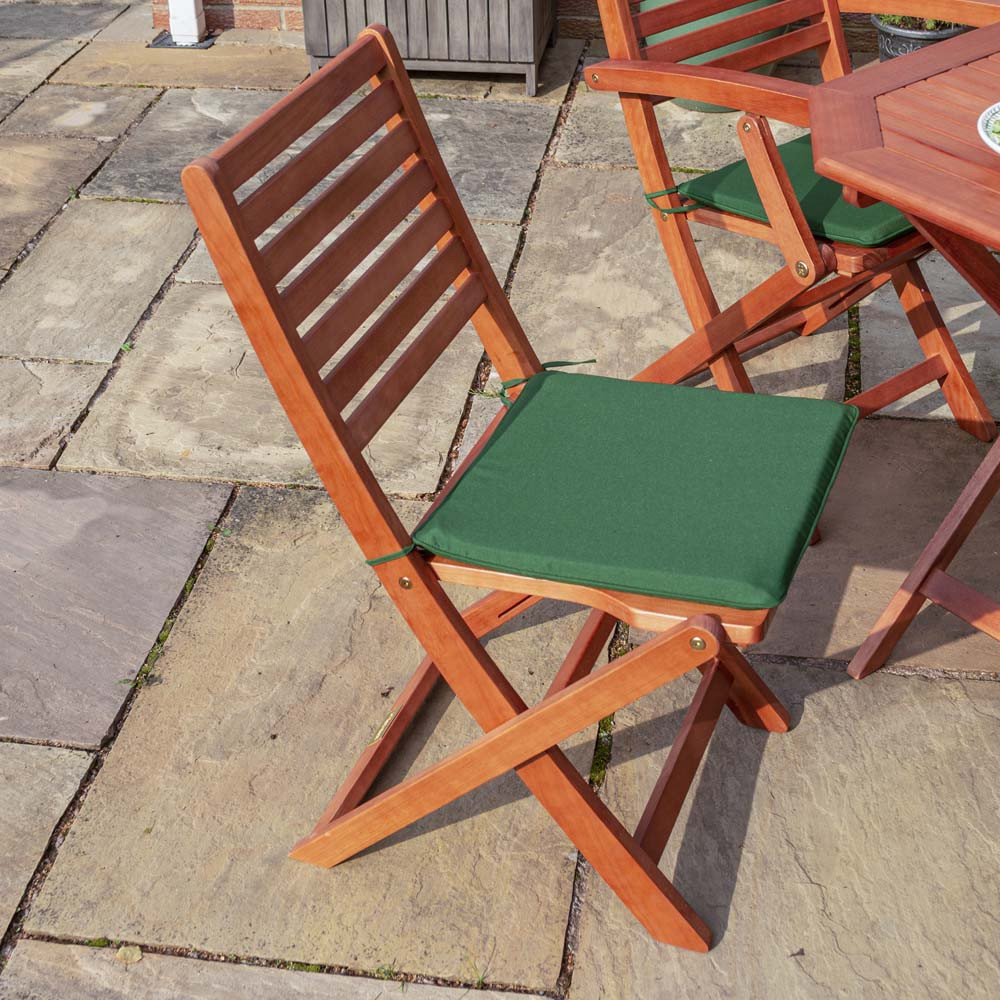 Ensuring enhanced comfort for all diners, each of the six chairs is equipped with a vibrant green seat cushion. These blend beautifully with not only the dining set's stained Eucalyptus hardwood frames but also your garden's surrounding plant life, trees and flowers.