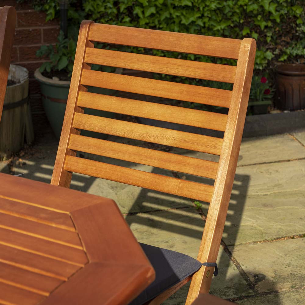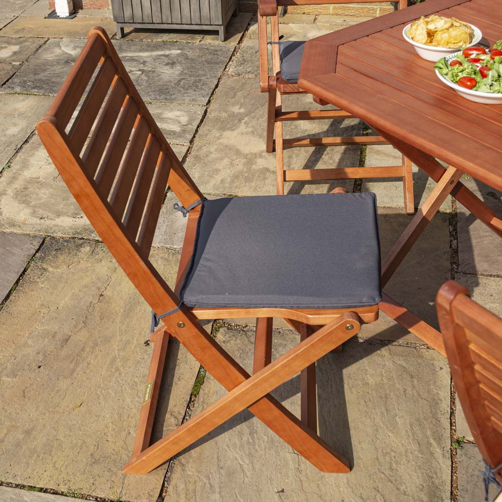 The dining set is manufactured from Eucalyptus hardwood, a strong and durable material that is more affordable than many other hardwood alternatives. Its dark stained finish helps the chairs, table and parasol frame achieve a modern yet sophisticated look that blends stylishly with the grey parasol canopy and matching seat cushions.