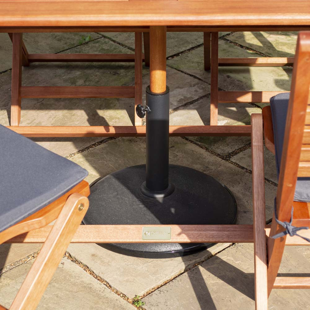 While the Plumley dining table features a central hole to stabilise your parasol when in use, the set also comes with a 15kg circular base for even greater support. The parasol is 2.7m tall and will provide you and your diners with plenty of shade.
