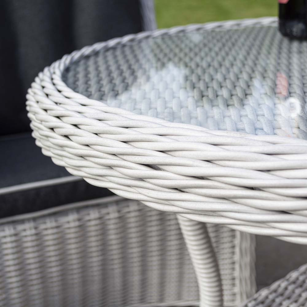 The set consists of two modern Putty Grey coloured rattan chairs and a decorative glass-topped table. This not only provides a flat and stable surface to place your drinks, but its wipe-clean surface also helps to protect the rattan weave from stains and spillages.