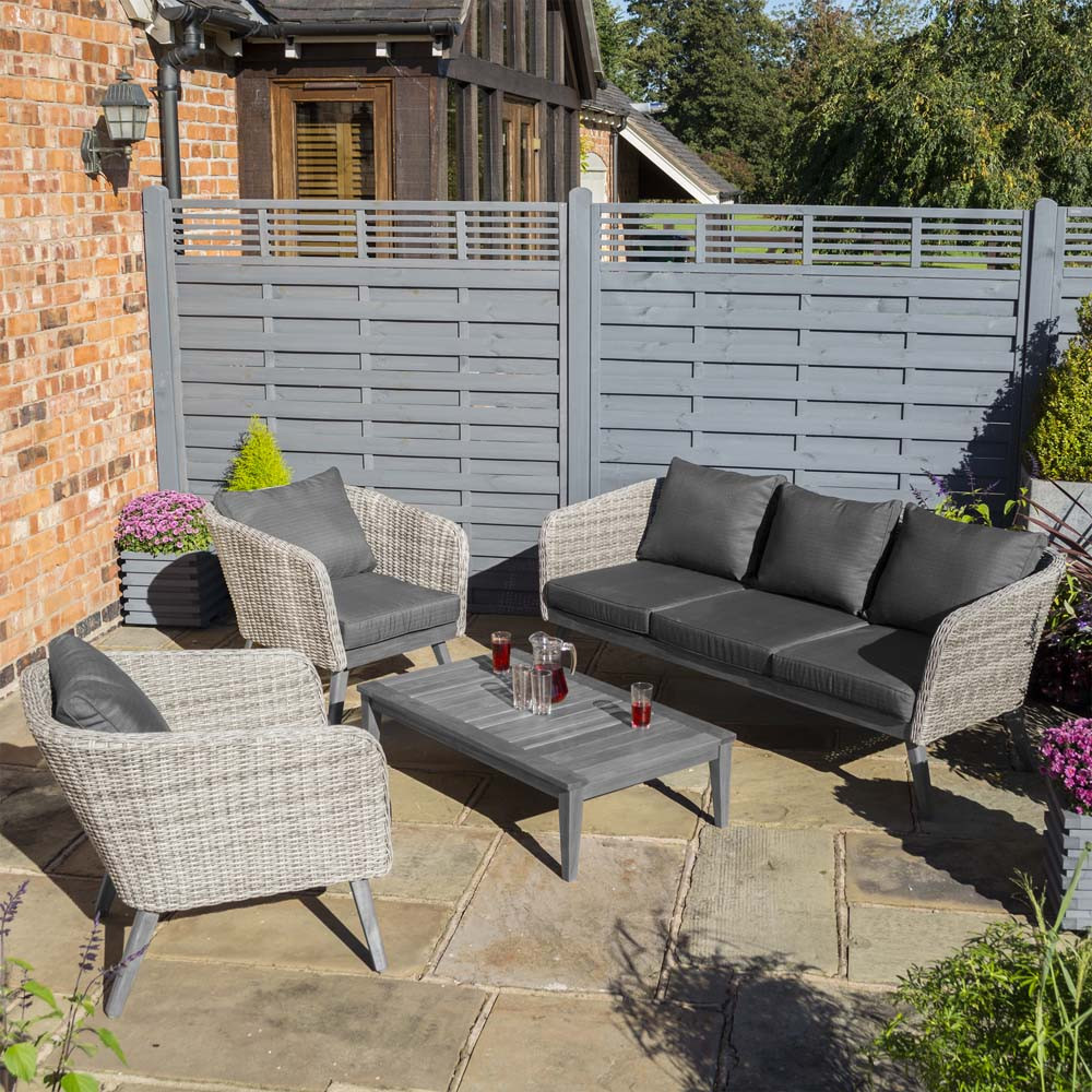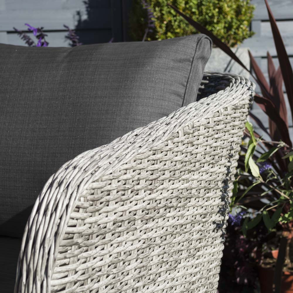 • Sofa and chairs feature a weatherproof wraparound rattan effect weave
