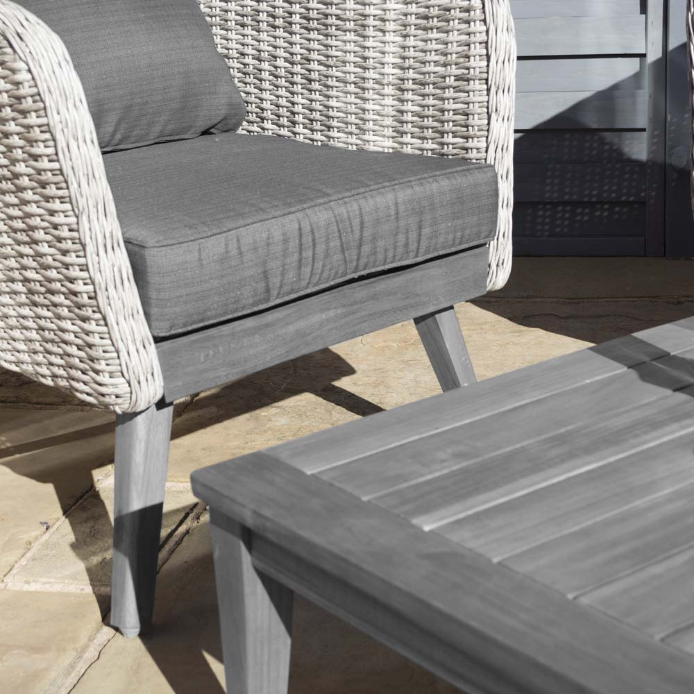 A modern take on a classic design, the Saigon Coffee Set by Rowlinson consists of a hardwood coffee table, two armchairs and a three-seater sofa. Ideal for a patio, veranda, balcony or conservatory, both the sofa and chairs feature an elegant weatherproof wraparound rattan effect weave, providing a chic finish.