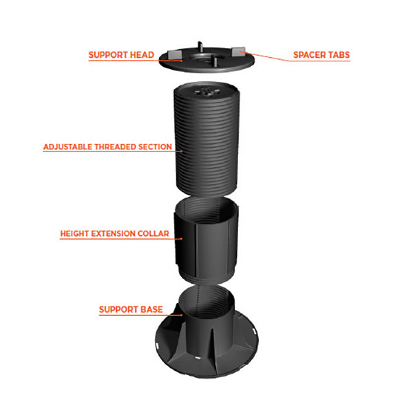The system consists of five essential parts: a support head for safely placing slabs, spacer tabs to ensure consistent spacing, an adjustable threaded section for customising the height, a height extension collar for incremental height adjustments (126mm each), and a robust support base.