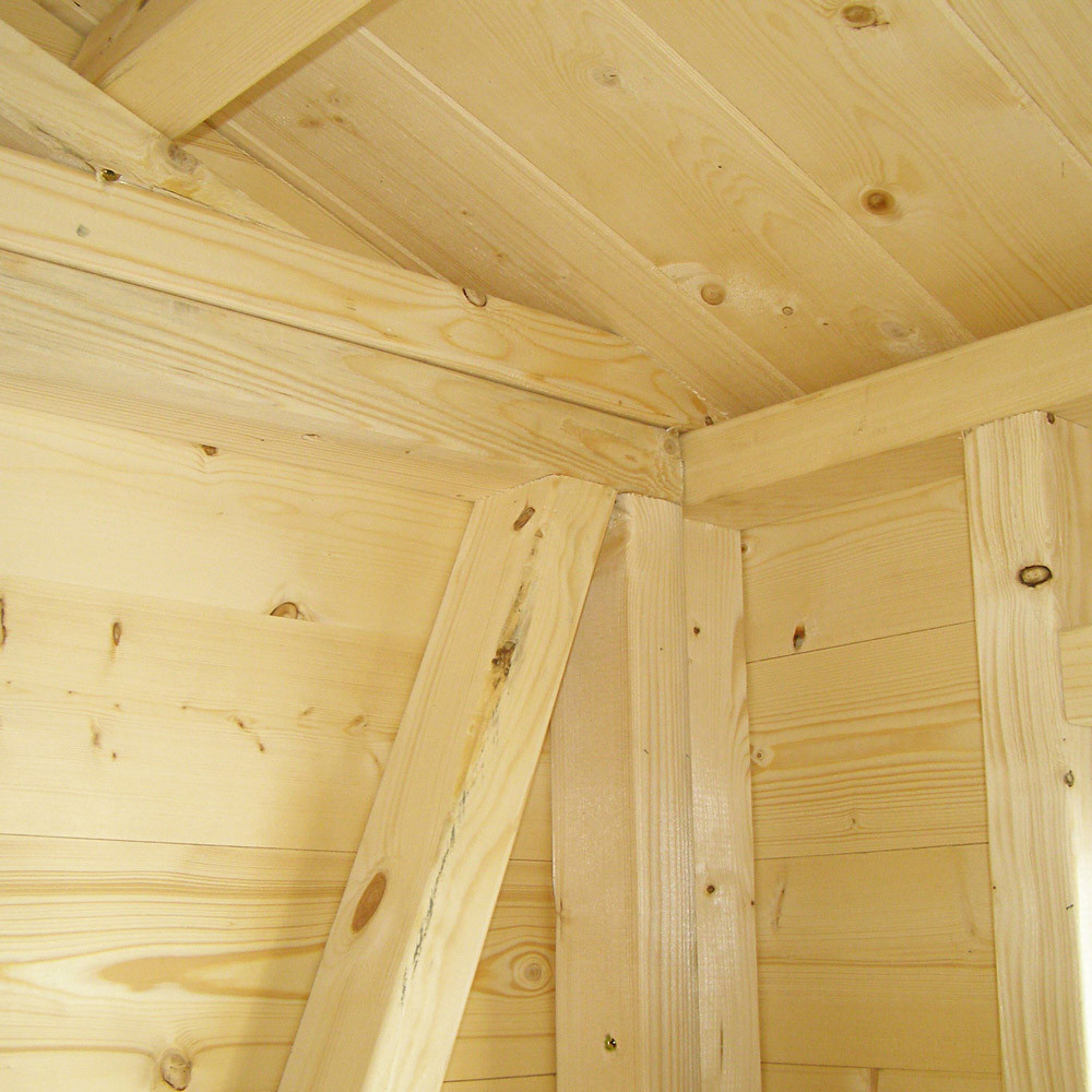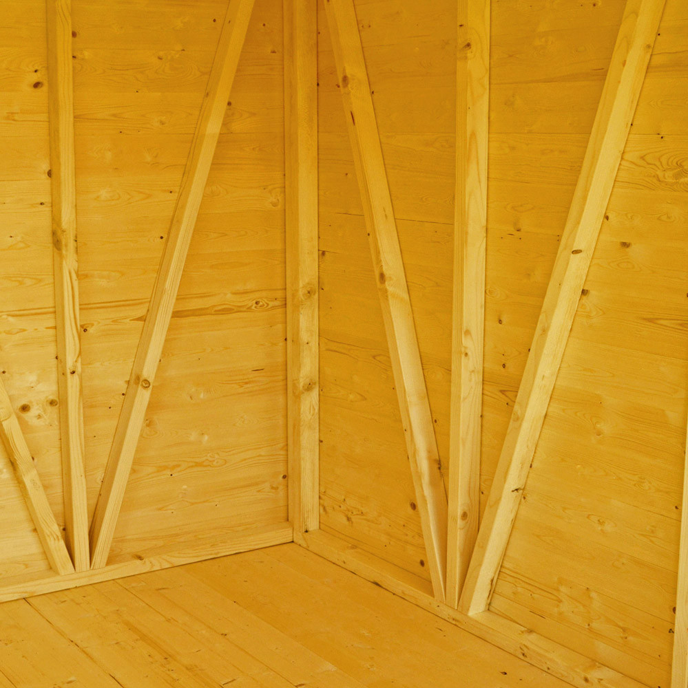 This is a robust and durable structure with a 3-inch x 2-inch (70mm x 44mm) heavy-duty framing, which is larger than the standard shed framing provided by Shire. Its tongue and grooved pine roof structure has an apex design and covered with a green mineral roofing felt to safeguard the workshop from water penetration. The flooring also features tongue and grooved boards, each measuring 16mm thick, which are attached to 70mm x 40mm joists.