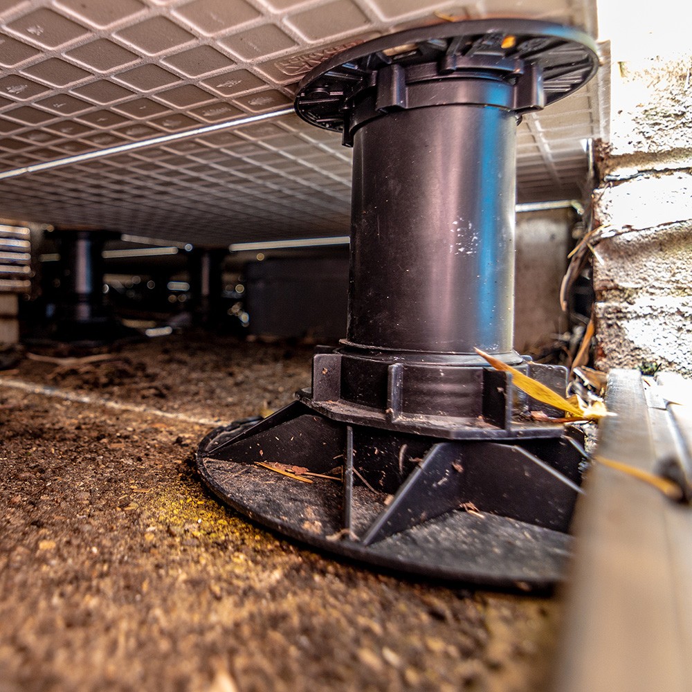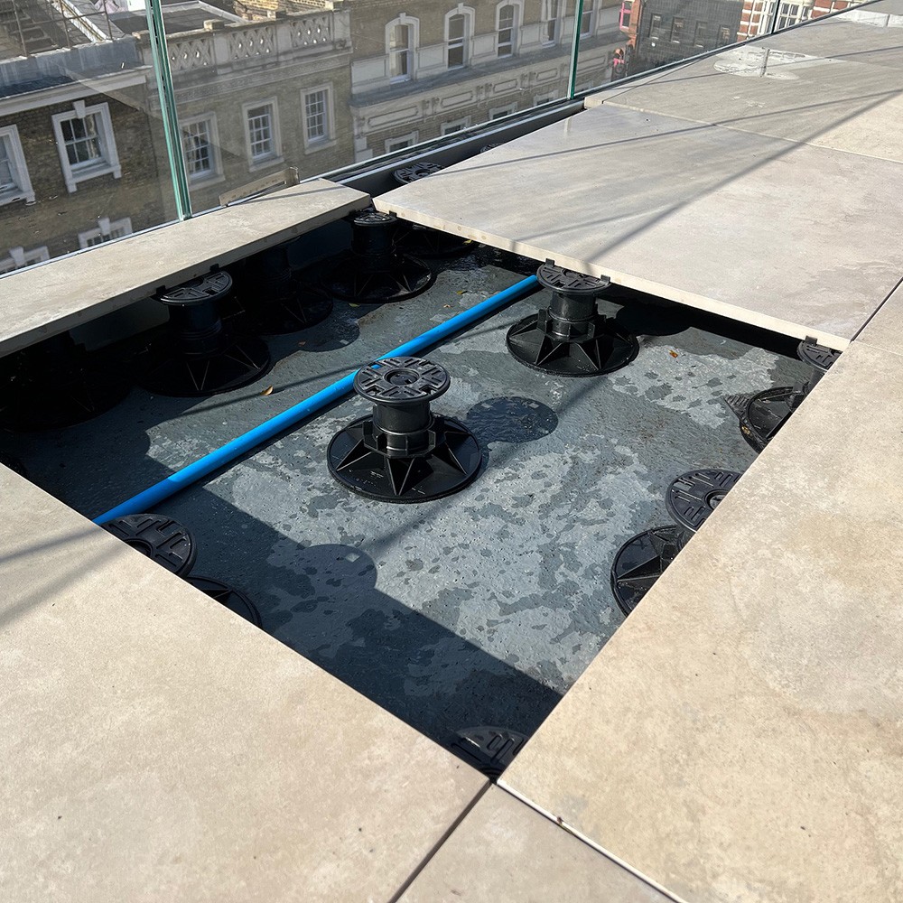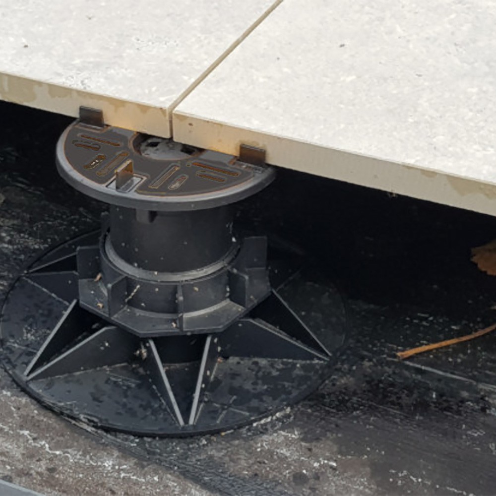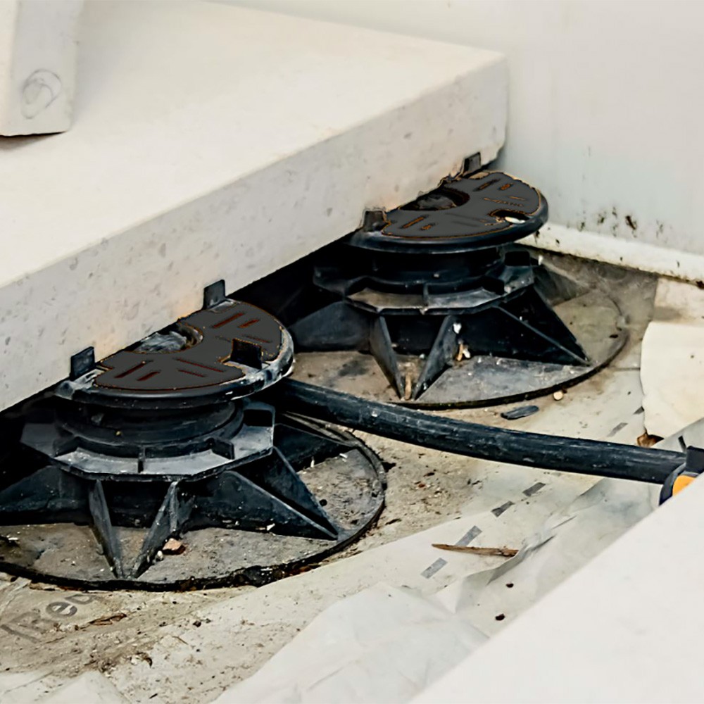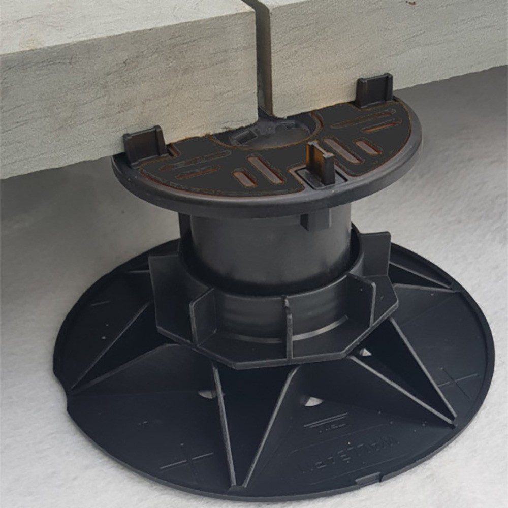 To save time during installation, the telescopic stem is twisted by hand and helps you create a completely flat upper surface. As a suspended system, the weight of the slab or decking keeps everything situated and in place. Rainwater can easily drain and run between and underneath to prevent pooling and reduce slippery surfaces.