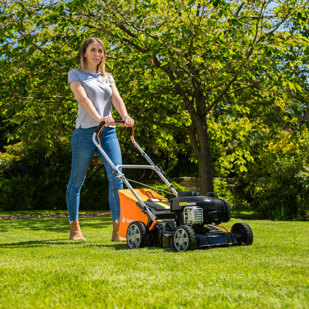 Find out moreThis Yard Force Self-Propelled Petrol Lawnmower is available with your choice of either a 40cm steel or 41cm (16") special diamond ground steel blade. It is the perfect companion for smaller lawns up to 400m² due to its lightweight, compact design and exceptional manoeuvrability.